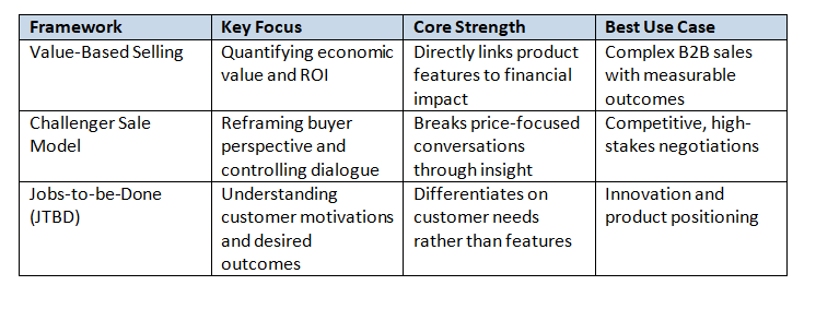 Each model complements the others. Combining value quantification (VBS), conversation control (Challenger), and customer-centric insight (JTBD) creates a powerful toolkit for avoiding price wars.