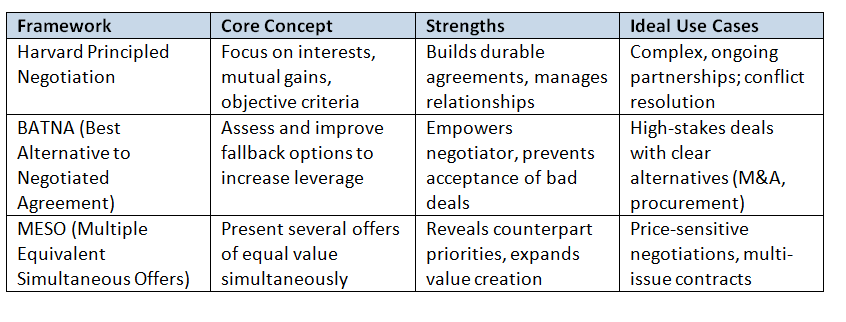 Key Frameworks and Models — Comparing Harvard Principled Negotiation, BATNA, and MESO