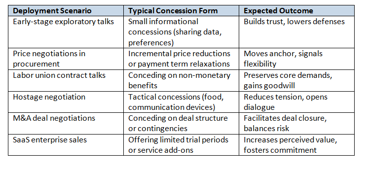 Concession tactics vary widely in form and intensity, ranging from subtle nudges to overt sacrifices. Their effectiveness depends on context, relationship dynamics, negotiation phase, and cultural factors. Below is a matrix illustrating common deployment scenarios and expected outcomes: