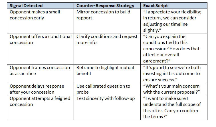 Recognizing when the other party uses concession tactics is critical to avoid exploitation and maintain leverage. Below is a table mapping common signals to effective counter-responses, including exact scripts: