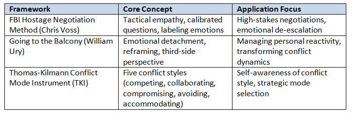 These frameworks complement each other by combining emotional regulation, strategic engagement, and self-awareness—cornerstones of effective conflict resolution.
