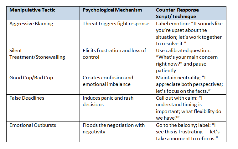 Difficult counterparts often deploy psychological tactics to unsettle negotiators emotionally or gain advantage. Recognizing these and having precise counter-responses is essential.