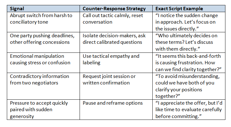 Detecting Good Cop Bad Cop when used against you is critical to maintaining negotiation power. Key signals include abrupt shifts in tone between interlocutors, inconsistent messaging, and emotional rollercoaster effects designed to destabilize.