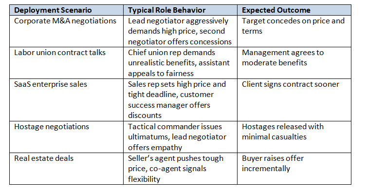 Begin the negotiation with the “bad cop” setting stringent demands or ultimatums. Use calibrated, assertive language. Example script: “We need your decision by end of day, or these terms will no longer be available. Frankly, we see no room for compromise here.”
