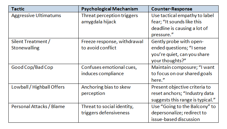 Difficult negotiators use various tactics that escalate deadlocks. Below is a table mapping common tactics to their psychological mechanisms and recommended counter-strategies.