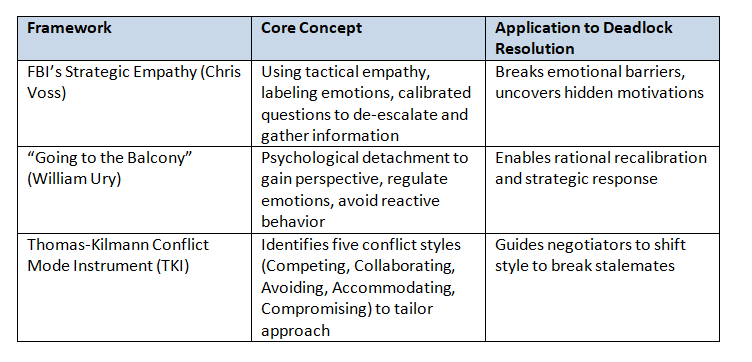 Breaking deadlocks in negotiation is as much a psychological battle as it is a strategic one. By understanding the emotional undercurrents — from amygdala hijack to social identity threats — and applying proven frameworks like tactical empathy and “Going to the Balcony,” negotiators can transform impasses into breakthroughs. The six-step process and real-world case studies equip you with practical tools to manage even the most stubborn conflicts.