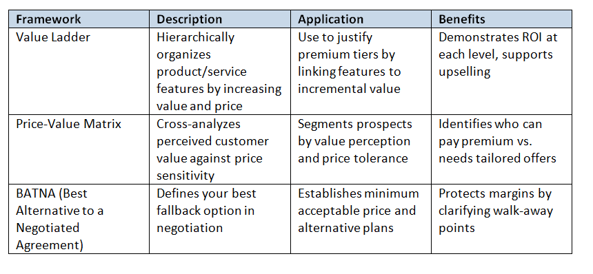 · Key Frameworks: Value Ladder, Price-Value Matrix, BATNA for Pricing