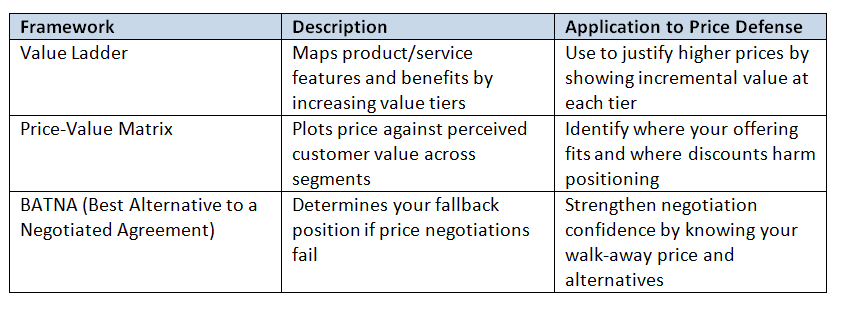 · Key Frameworks for Pricing Defense: Value Ladder, Price-Value Matrix, BATNA