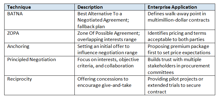 Enterprise negotiation success hinges on applying structured frameworks and psychological principles to manage complex discussions. Key frameworks include: