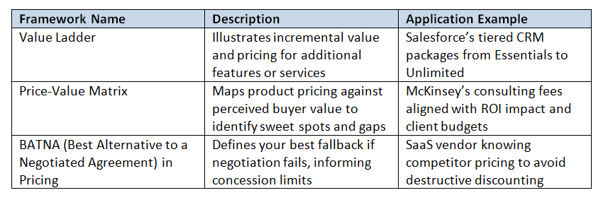 · Key Frameworks: Value Ladder, Price-Value Matrix, BATNA in Pricing