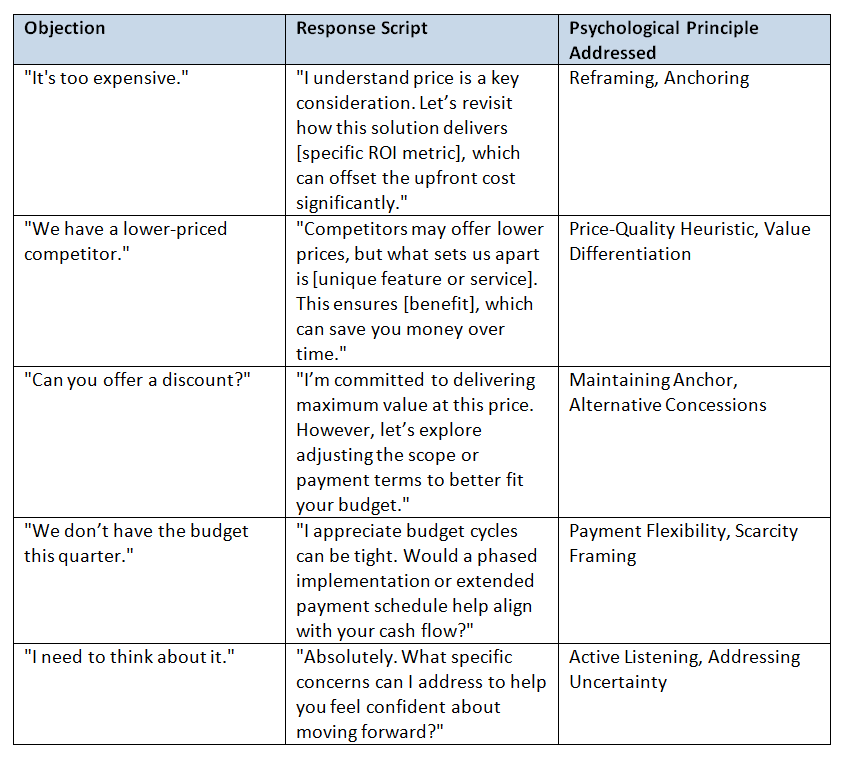 · Objection Handling: Scripts for Common Price Objections