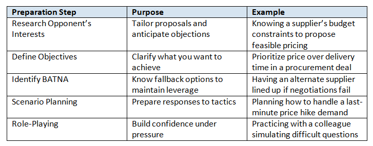 · Research thoroughly: Know the other party’s interests, constraints, and alternatives (BATNA - Best Alternative To a Negotiated Agreement).