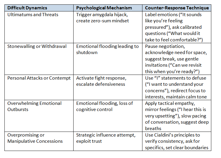 High-emotion negotiations often feature tactics that exacerbate conflict. The table below maps common difficult dynamics, their psychological mechanisms, and recommended counter-responses.