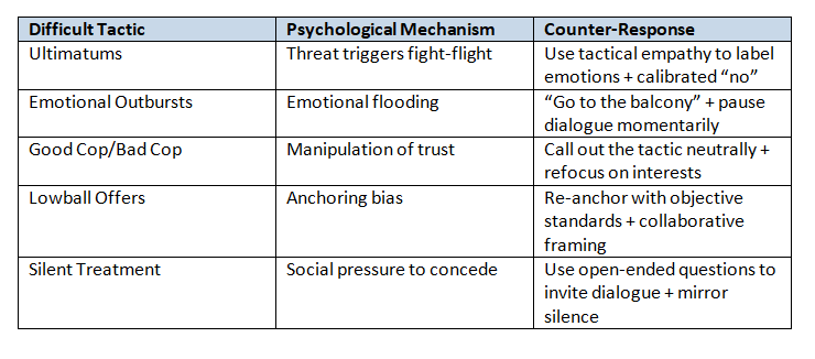By mapping tactics to their psychological roots, negotiators can deploy precise countermeasures that reduce escalation and maintain control.