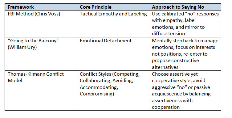 Each framework complements the others, providing a toolkit to manage both the psychological and strategic complexity of saying no.