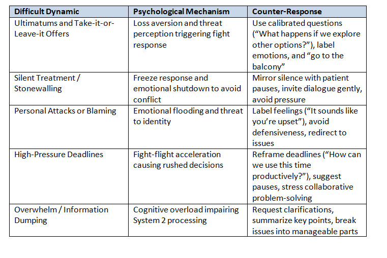 Negotiators encounter specific challenging tactics that escalate tension and risk breakdown. The table below maps common difficult dynamics, their psychological mechanisms, and precise countermeasures.