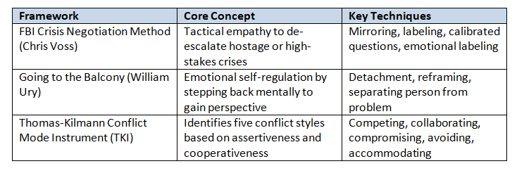 Understanding and integrating these frameworks equips negotiators to manage tension proactively and recover when conflicts escalate.