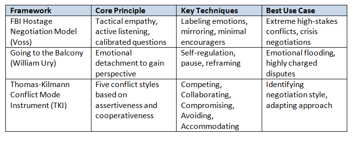 The FBI model focuses on establishing rapport through empathy and carefully crafted questions, leveraging influence without confrontation. Ury’s “Going to the Balcony” is a mindfulness-based strategy to avoid escalation by mentally stepping back, allowing clear-headed choices. The TKI model enables negotiators to diagnose their own and the opponent’s style, choosing adaptive responses such as collaboration or accommodation depending on goals and relationship priorities.