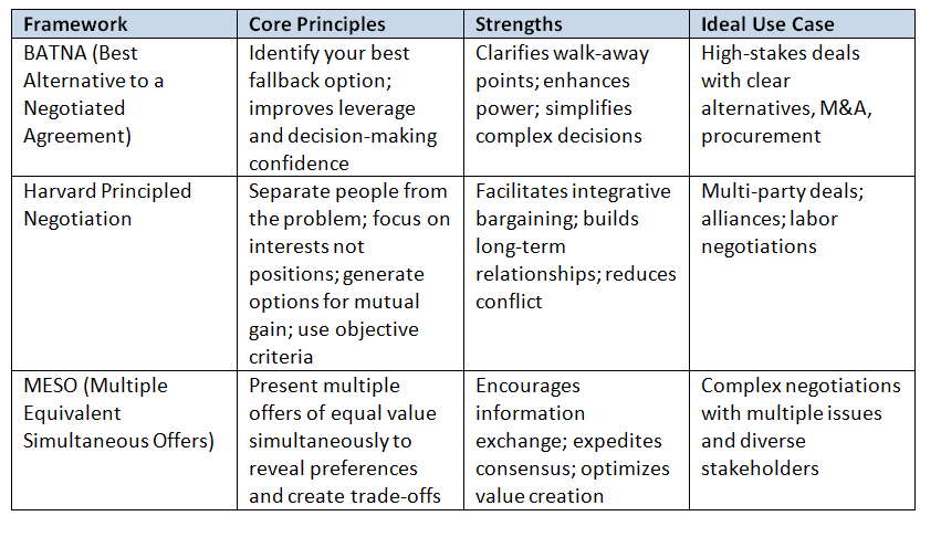· Key Frameworks and Models: BATNA, Harvard Principled Negotiation, MESO