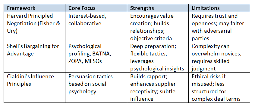 Procurement leaders often combine these frameworks. For example, they may use Harvard’s principled negotiation to frame discussions, Shell’s BATNA analysis for preparation, and Cialdini’s principles during interpersonal engagement. Understanding their synergies and limitations ensures a tailored approach that aligns with organizational culture and deal complexity.