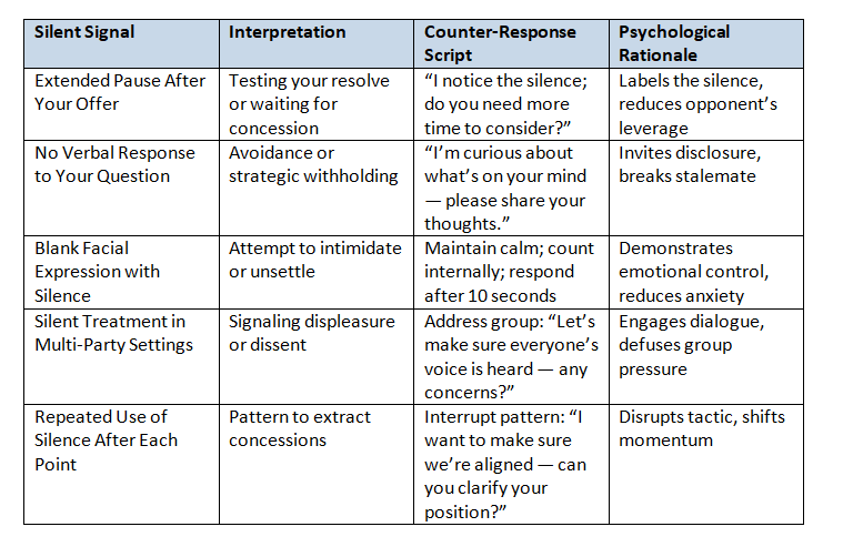 When others use silence against you, recognizing and responding appropriately is critical to maintain control. The following table maps common silent signals to effective counter-responses with exact scripts.