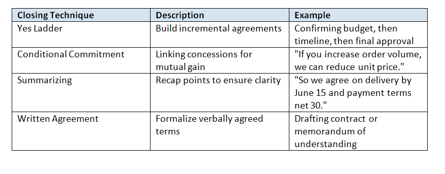 The final phase of negotiation—closing the deal—requires clarity, confidence, and precision. Closing strategies should aim to solidify agreement while preserving the relationship.