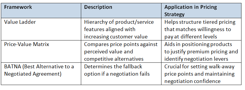 · Key Frameworks: Value Ladder, Price-Value Matrix, BATNA