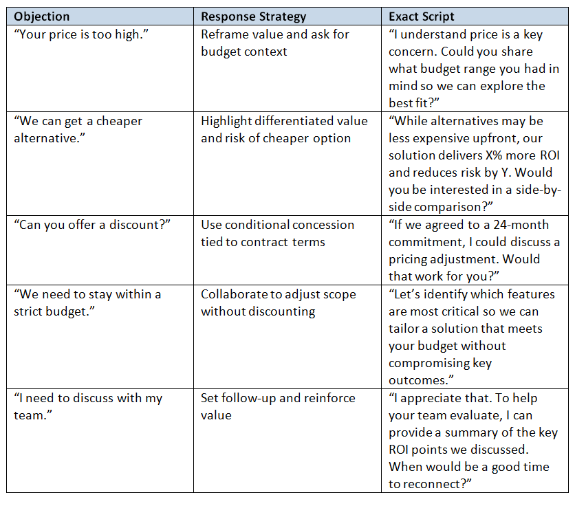 Below is a matrix mapping common price objections to precise, proven word-for-word responses.